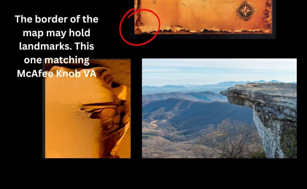 - The magnifying glass with tree and words of ‘look & around’ – have been considered to hint to ‘Big Branch Overlook’ – near the trailhead of LRP