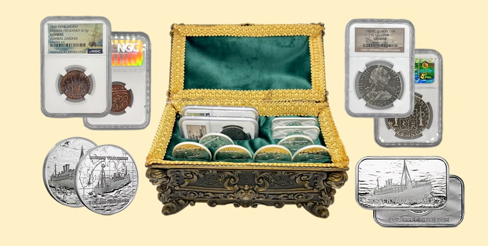 Our treasure contains 8 ounces of reclaimed silver from the SS Tilawa shipwreck, which was sunk in the Indian Ocean in 1942 after being struck by a torpedo from the Japanese Navy. Also included is a 8 reales coin from the El Cazador that was sent from Spain in 1784, by King Carlos III, to Louisiana. The ship never reached New Orleans and was discovered in The Gulf of Mexico in 1993. Lastly, our treasure contains a 10 cash coin from the Admiral Gardner shipwreck in 1809. The British East India Company ship hit a storm in the English Channel while heading to India and never returned.