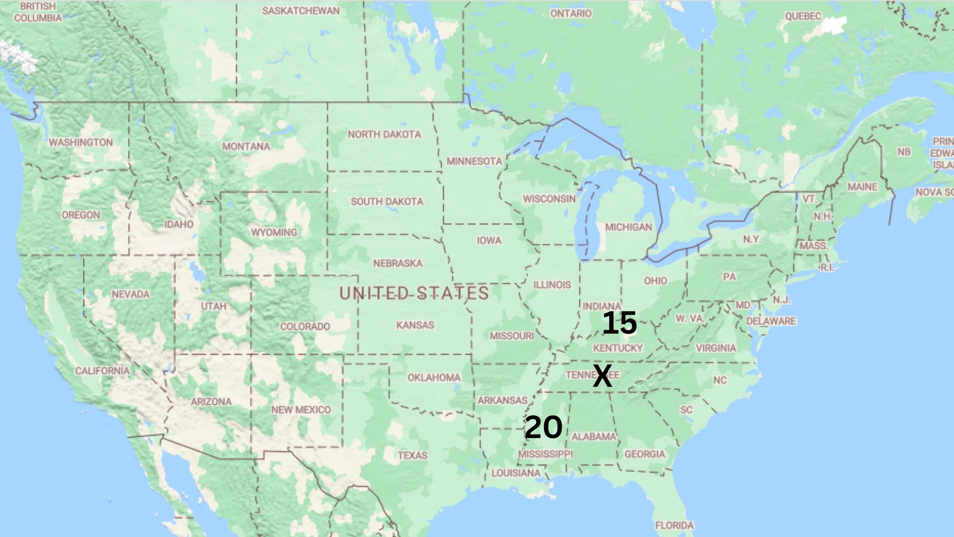 On a map – Tennessee is between them! X marks the spot. 15 X 20